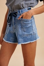 DAISY PRINT STRETCH DENIM BELTED SHORTS - LATE FEB