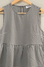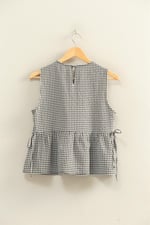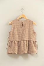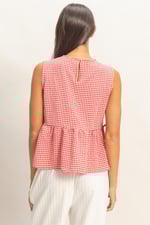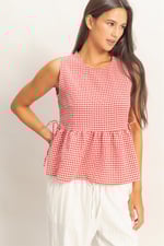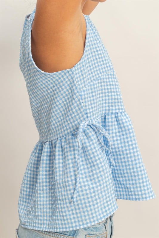 Embrace sunny days with this textured gingham, designed for effortless charm. It features a classic round neckline and a breezy sleeveless cut. The silhouette is defined by a playful peplum hem accented with delicate side tie details. Finished with a back keyhole button closure, pair it with high-waisted denim for a chic daytime look.