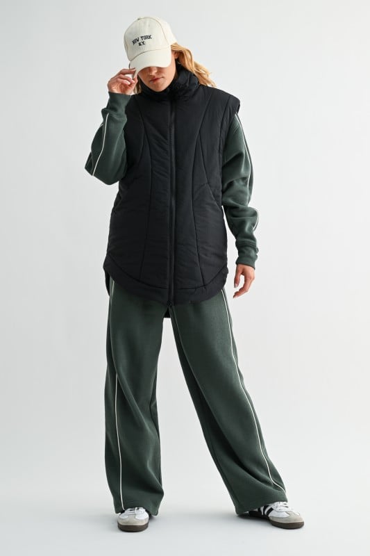A sleek and cozy cold-weather layer, this longline puffer vest features a plush fleece interior for extra warmth, snap-closure pockets to secure your essentials, and a full-zip front that extends into a mock neck for wind protection. The curved hem and structured seaming details give it a flattering, elevated silhouette.